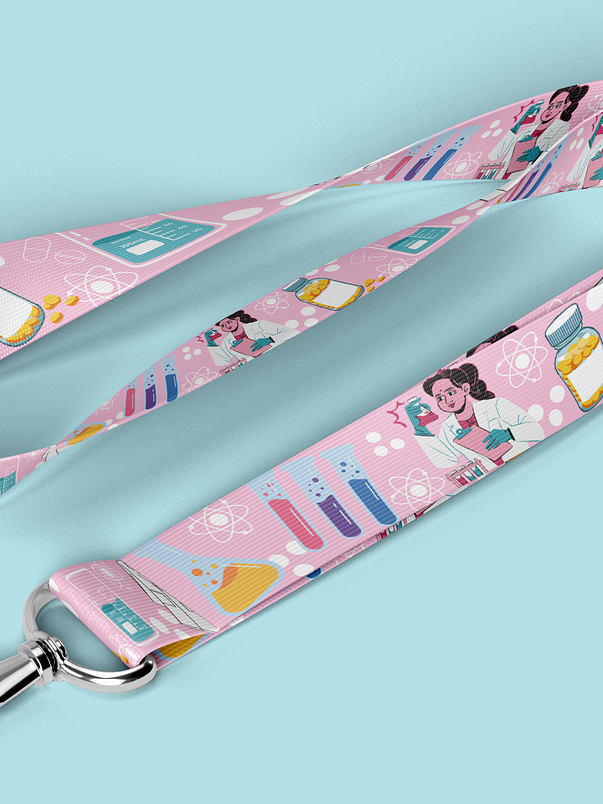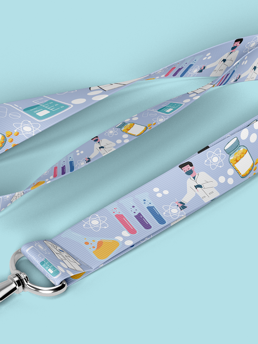 El lanyard con motivos de químico farmacéutico es el accesorio perfecto para los profesionales y entusiastas de la química farmacéutica. Este lanyard está diseñado con colores vibrantes y estampados temáticos que representan elementos y símbolos relacionados con la industria